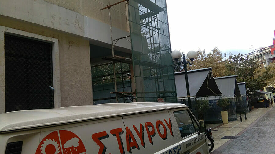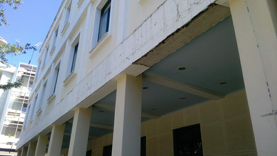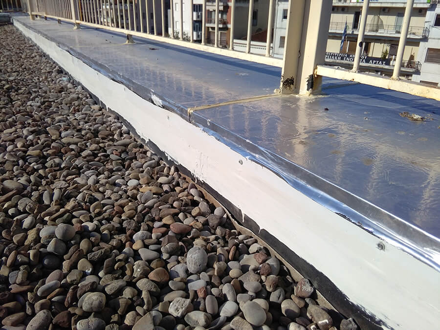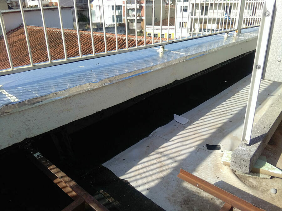 Αποκατάσταση πρόσοψης και προστασία με ελαστομερές ακρυλικό επίχρισμα. Επιδιόρθωση στεγάνωσης περιμετρικά του δώματος με μεμβράνη EPDM-Butyl.
