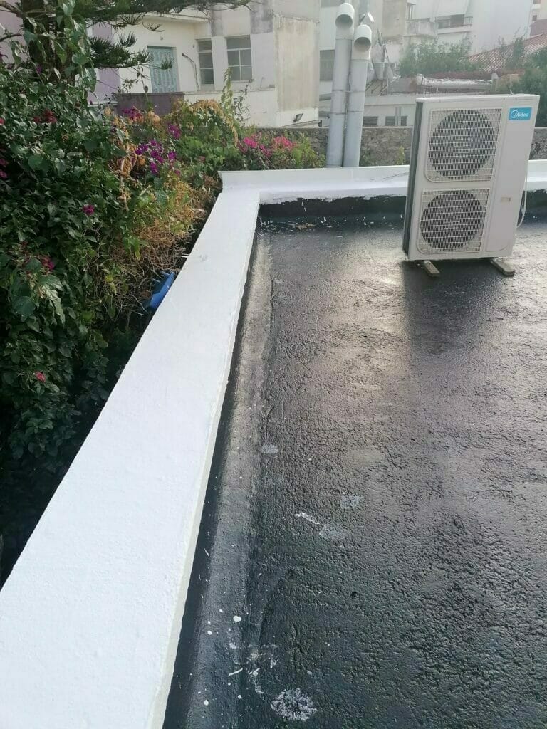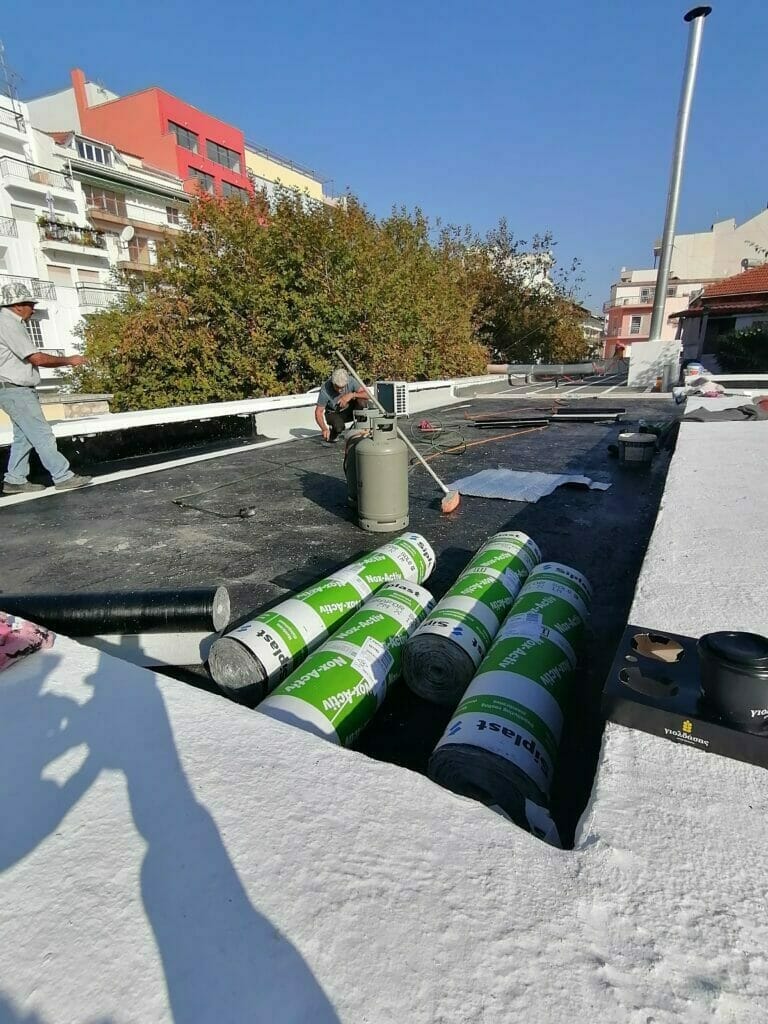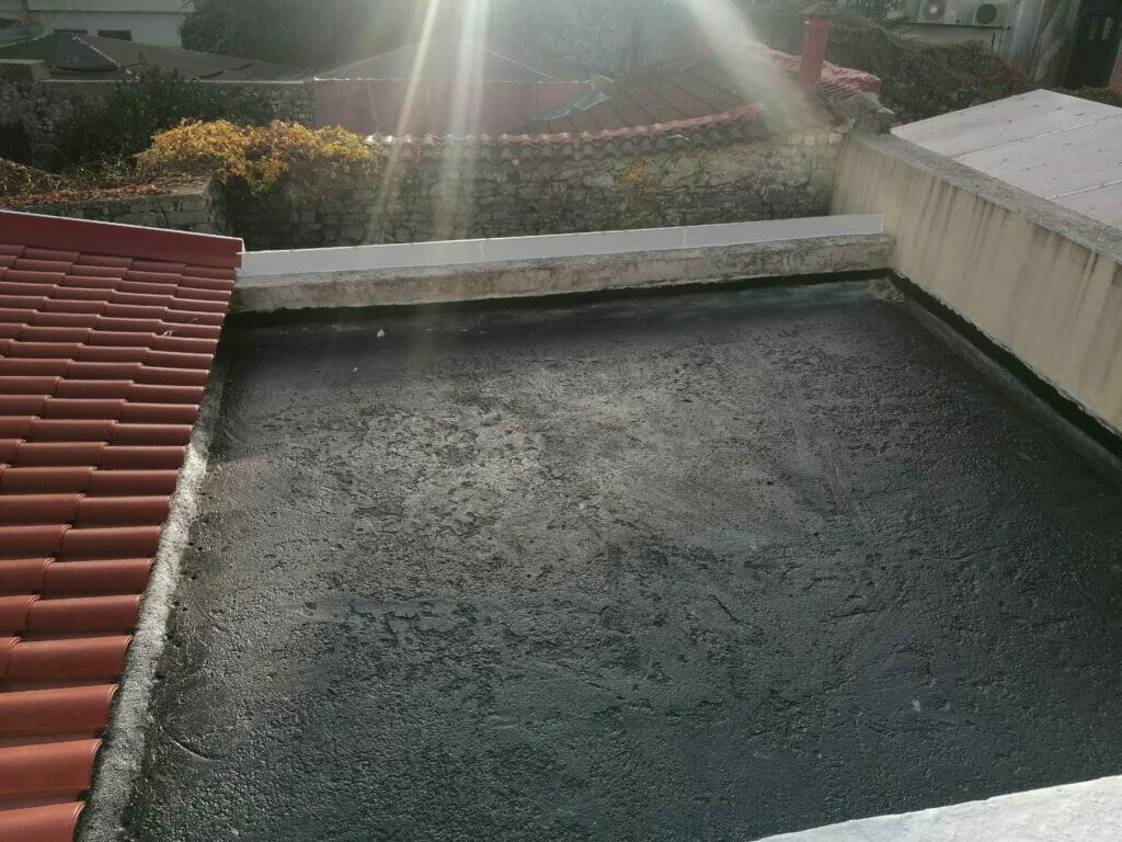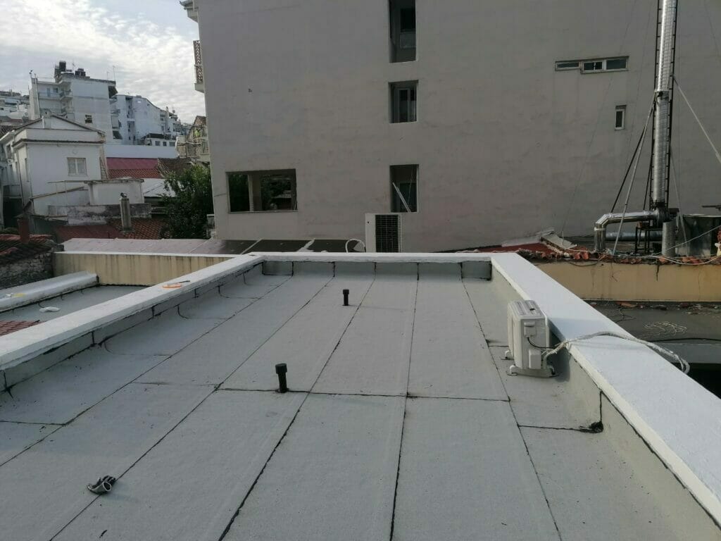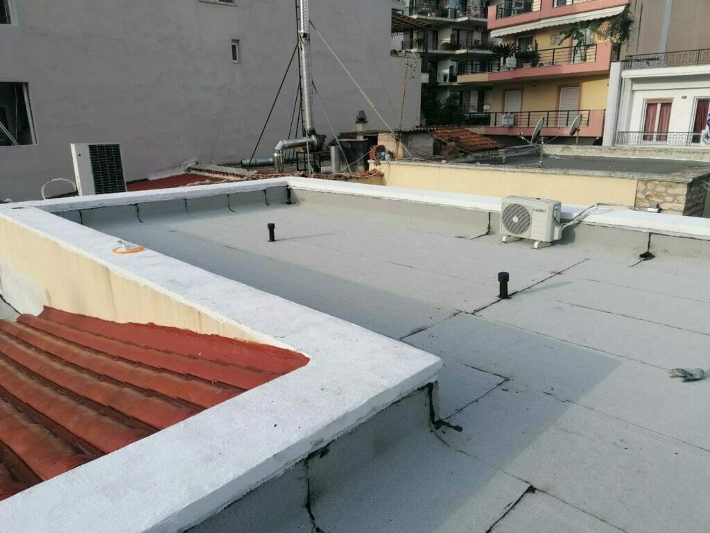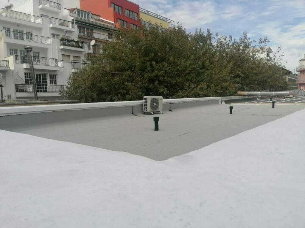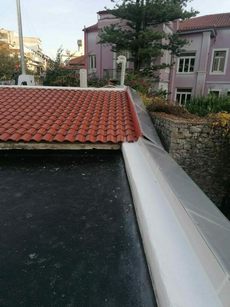 Οι εργασίες που πραγματοποιήθηκαν για την στεγάνωση είναι οι εξής: Καθαρισμός και αποκατάσταση της επιφάνειας, επάλειψη ασφαλτικού γαλακτώματος διαλύτου, στεγάνωση στηθαίων με το υβριδικό ελαστομερές Neoroof της Neotex, τοποθέτηση εξαερισμών ανα 25m2 και επικόλληση Γαλλικής ασφαλτικής μεμβράνης τύπου Parafor 6 Kg/m2