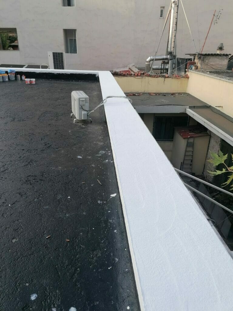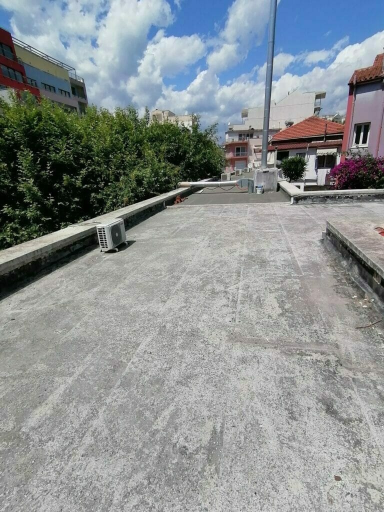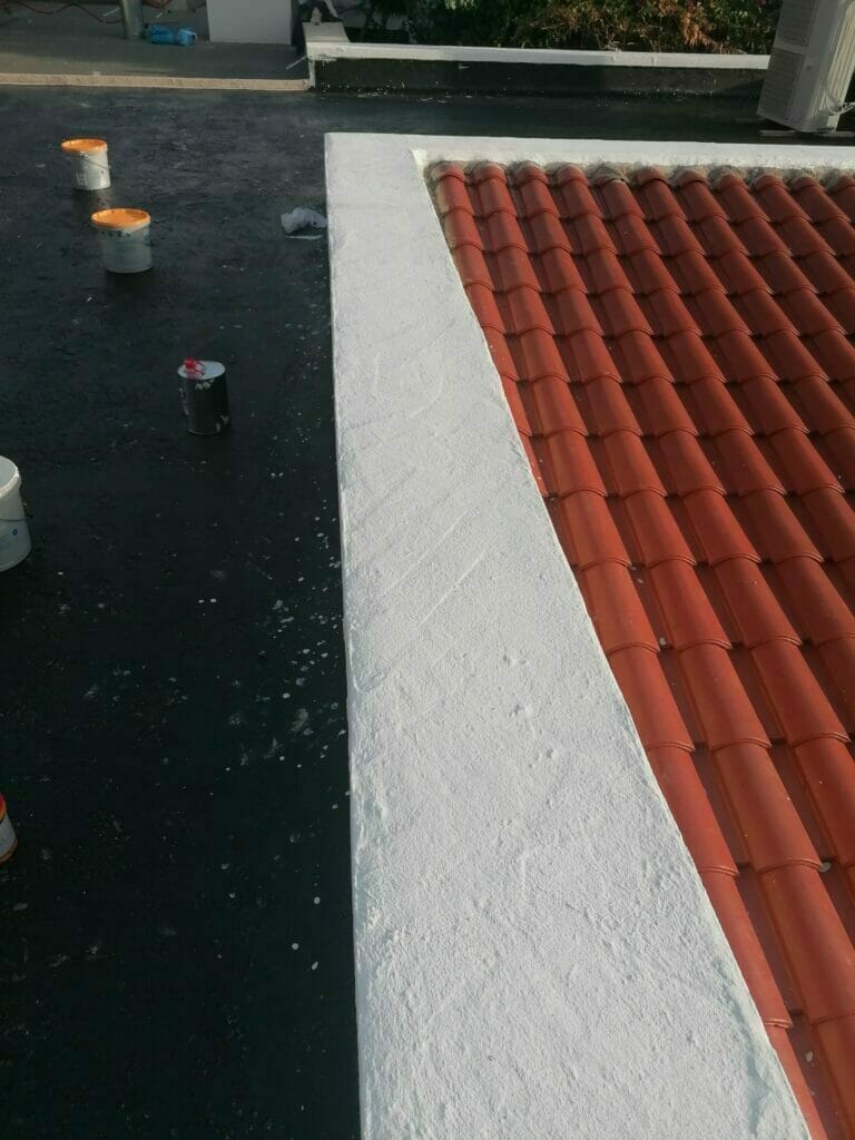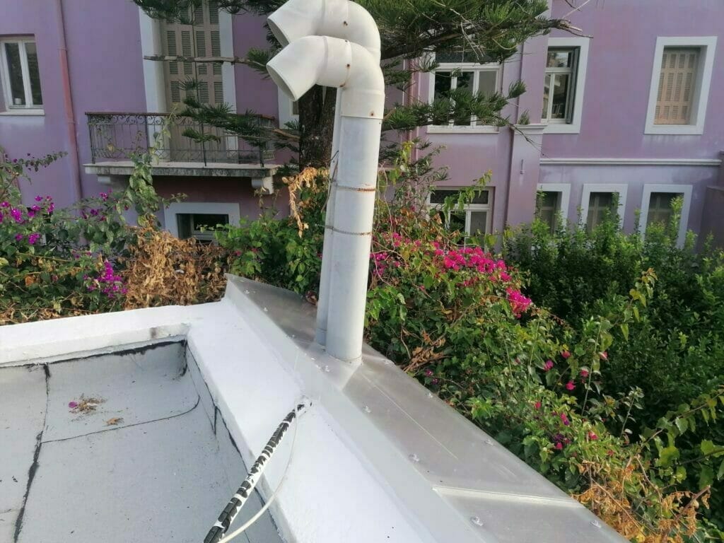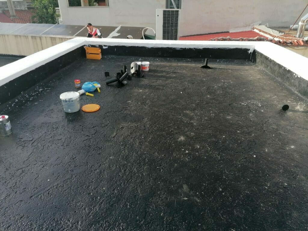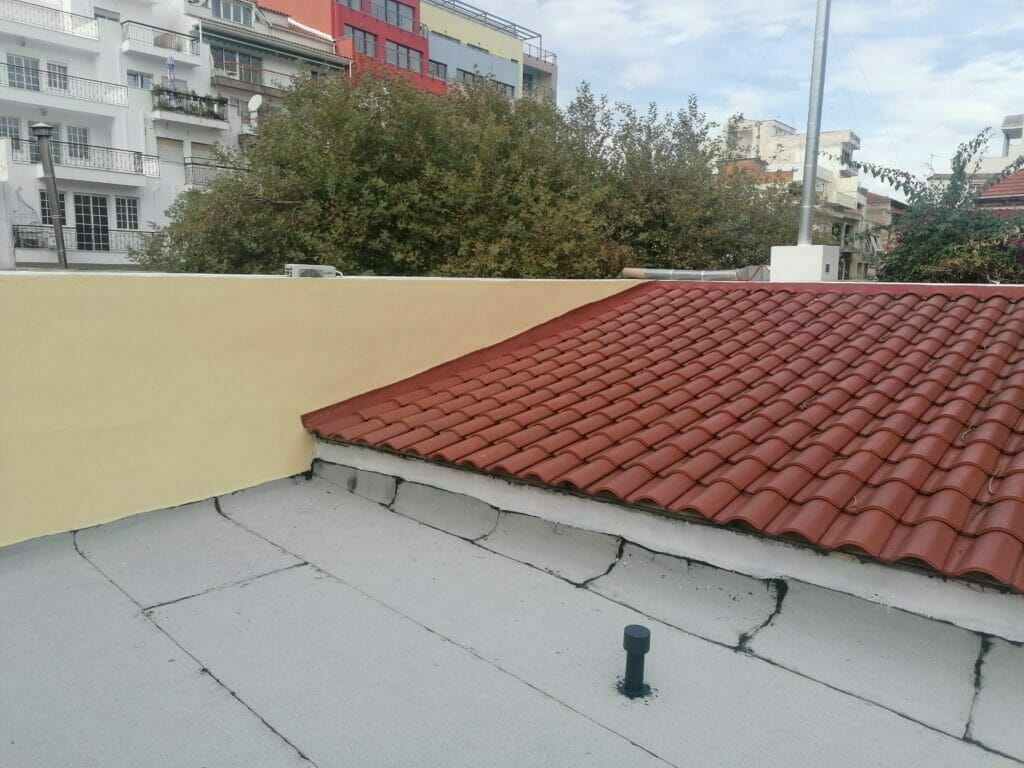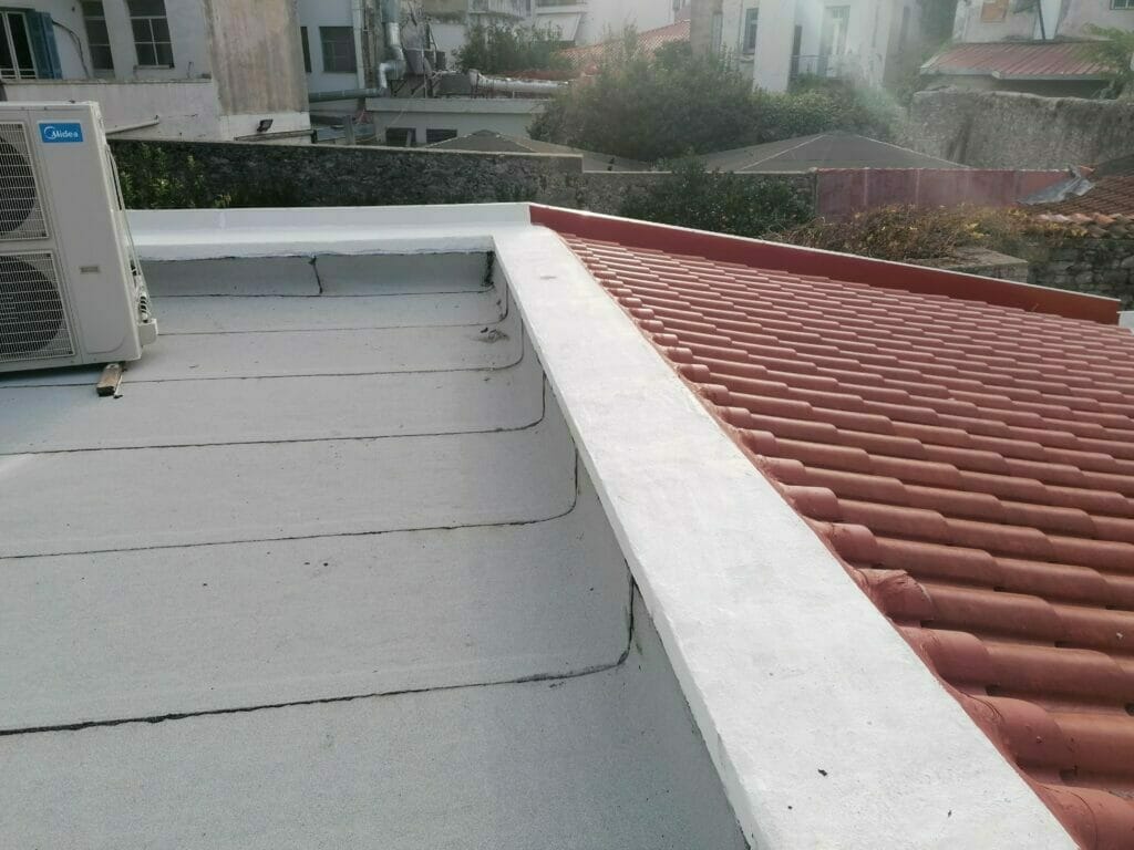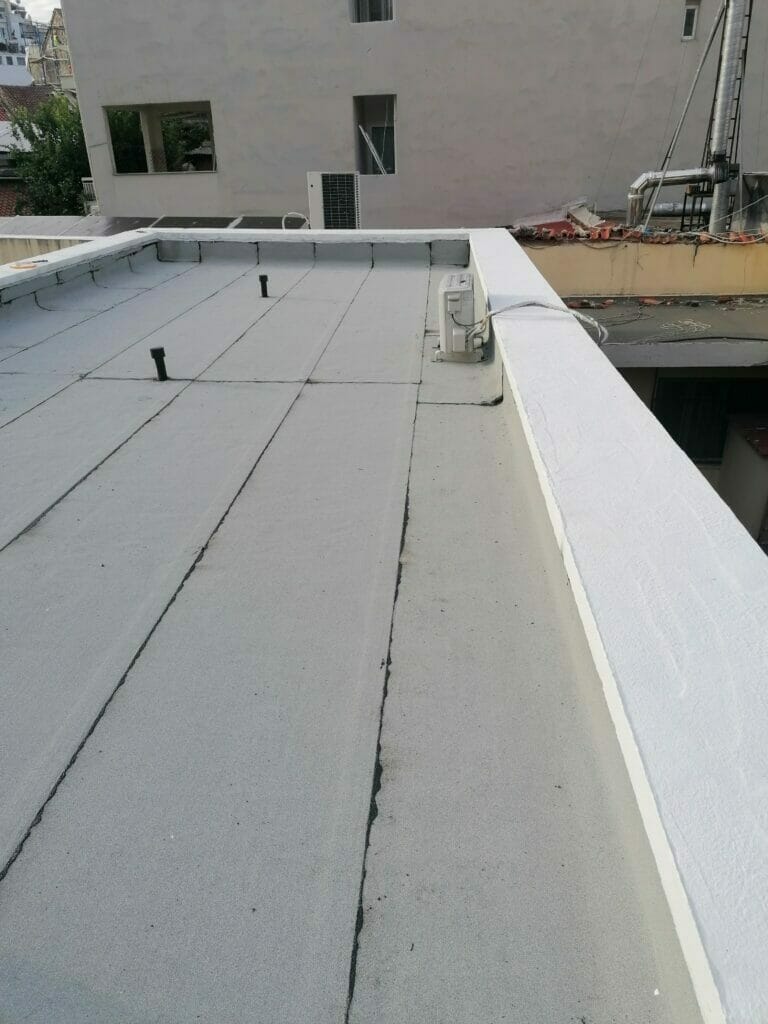 Οι εργασίες που πραγματοποιήθηκαν για την στεγάνωση είναι οι εξής: Καθαρισμός και αποκατάσταση της επιφάνειας, επάλειψη ασφαλτικού γαλακτώματος διαλύτου, στεγάνωση στηθαίων με το υβριδικό ελαστομερές Neoroof της Neotex, τοποθέτηση εξαερισμών ανα 25m2 και επικόλληση Γαλλικής ασφαλτικής μεμβράνης τύπου Parafor 6 Kg/m2