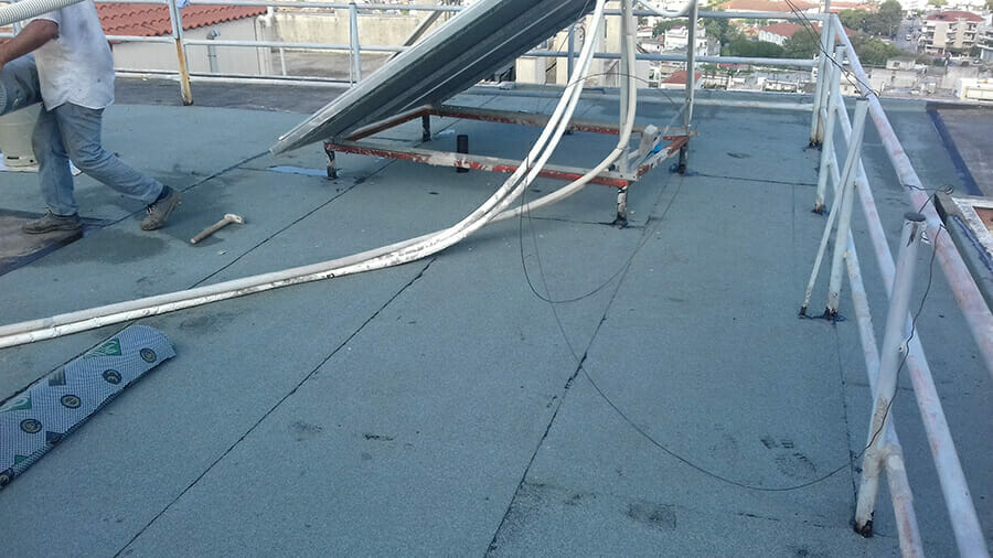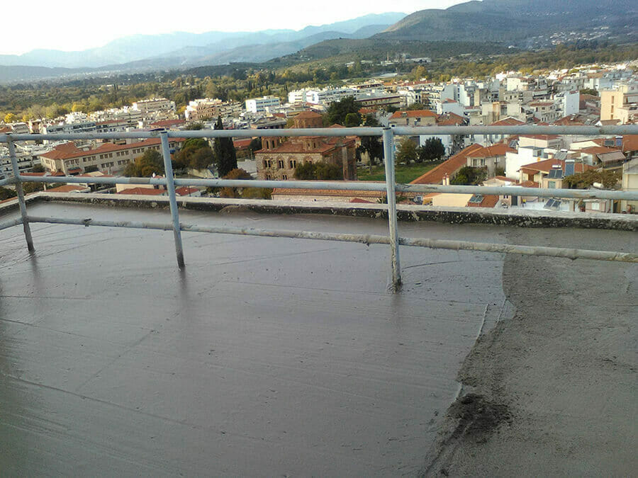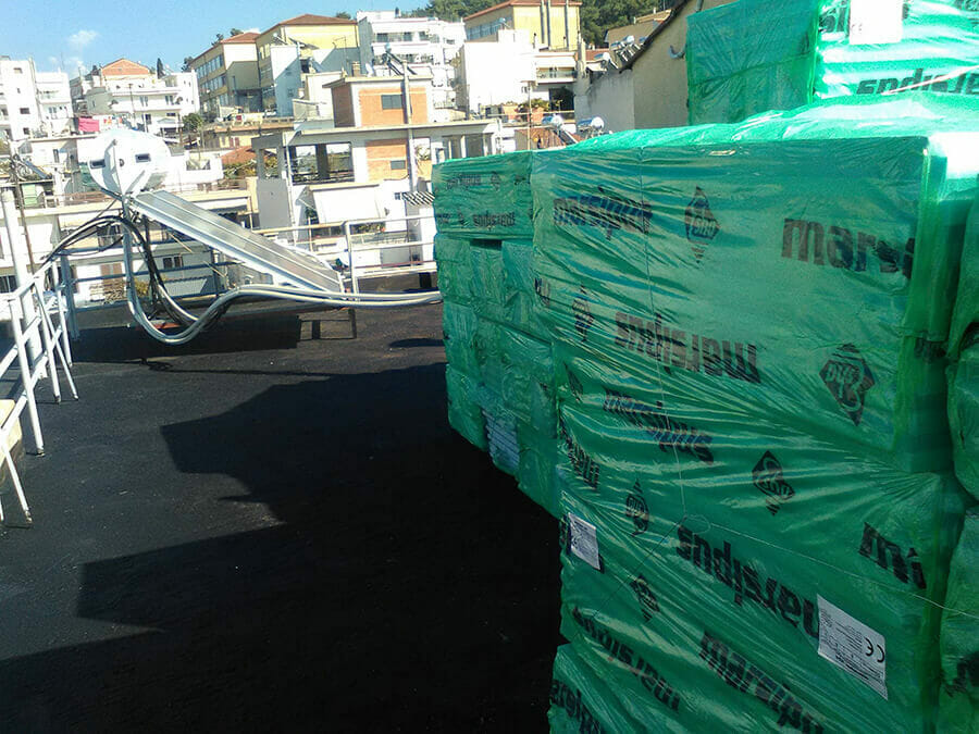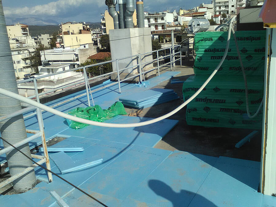 Συμβατική μόνωση δώματος. Οι εργασίες που πραγματοποιήθηκαν είναι οι εξής: Καθαρισμός επιφάνειας, φράγμα υδρατμών, τοποθέτηση εξυλασμένης πολυστερίνης, δημιουργία ρύσεων με ελαφρομπετόν, επάλειψη ασφαλτικού γαλακτώματος, τοποθέτηση εξαερισμών ανα 25m2 και επικόλληση ασφαλτικής μεμβράνης τύπου Eshadien 5Kg/m2